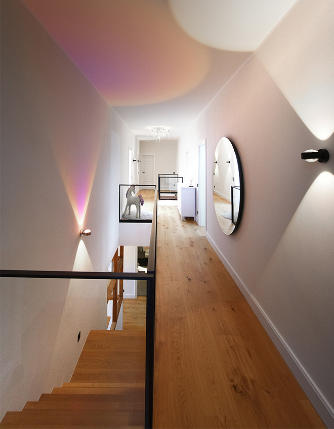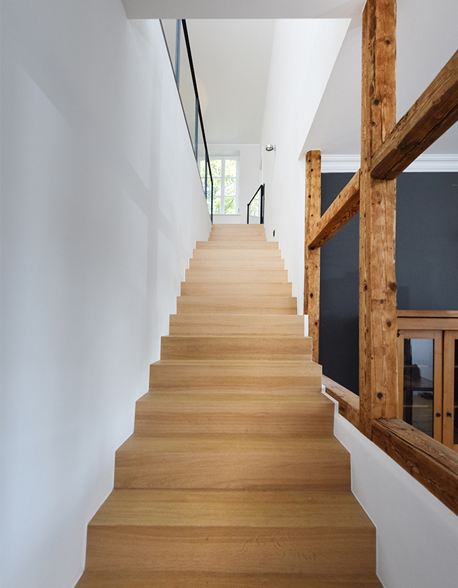 Der historische Bau wurde von innen vollständig neu organisiert, ohne seine ursprüngliche Struktur zu verleugnen. Großzügige Raumfolgen, klare Sichtachsen und natürliche Belichtung prägen die neue Ordnung. Transparente Übergänge zwischen den Ebenen und das Spiel aus offenen und geschlossenen Bereichen schaffen eine helle, ruhige Atmosphäre. Historische Elemente bleiben sichtbar und bilden die identitätsstiftende Basis des modernen Raumkonzepts.