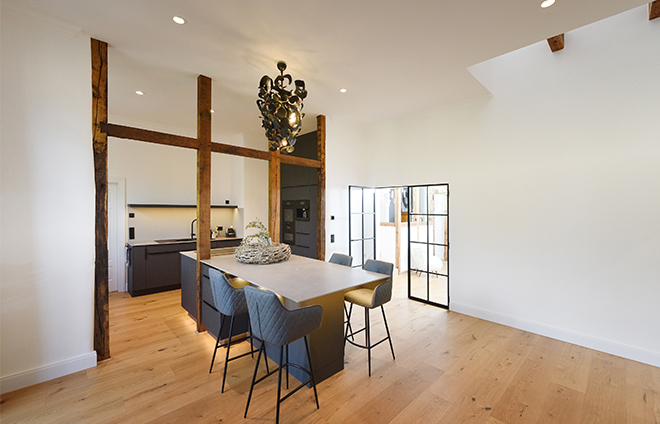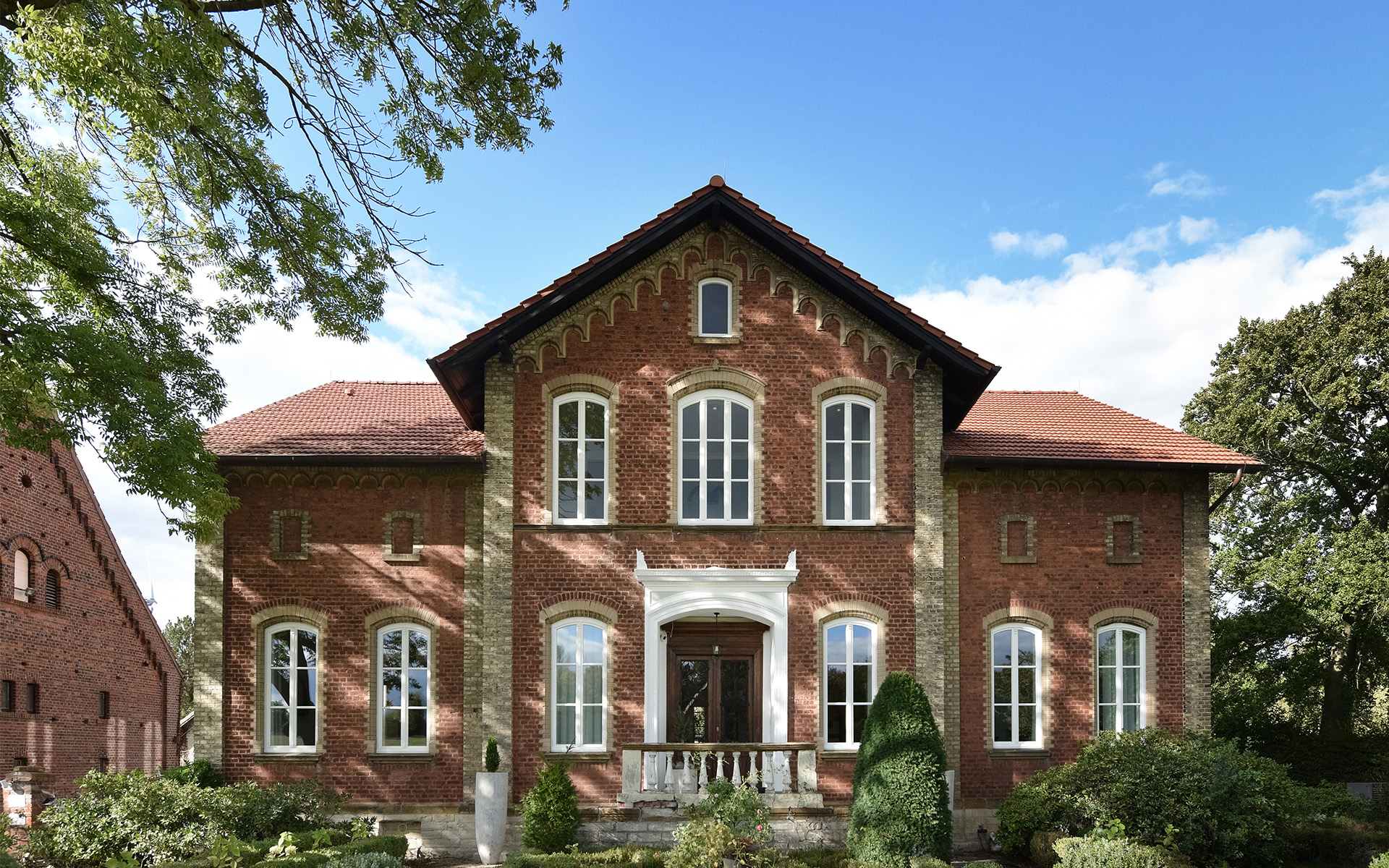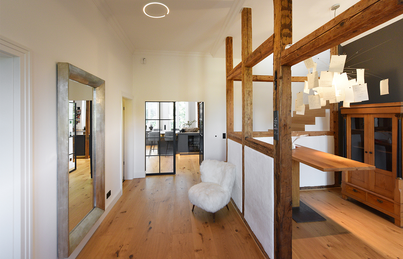 Die Materialwahl folgt dem Leitgedanken des behutsamen Weiterbauens. Außen wurden originale Ziegel, Sandstein und Putzflächen restauriert und ergänzt, innen prägen geölte Holzdielen, sichtbare Fachwerkstrukturen und handwerklich ausgeführte Details das Erscheinungsbild. Stahl und Glas setzen präzise zeitgenössische Akzente, ohne den Charakter des Denkmals zu überlagern. So entsteht ein Gleichgewicht zwischen Bestand und neuer Architekturschicht – respektvoll, klar und dauerhaft.